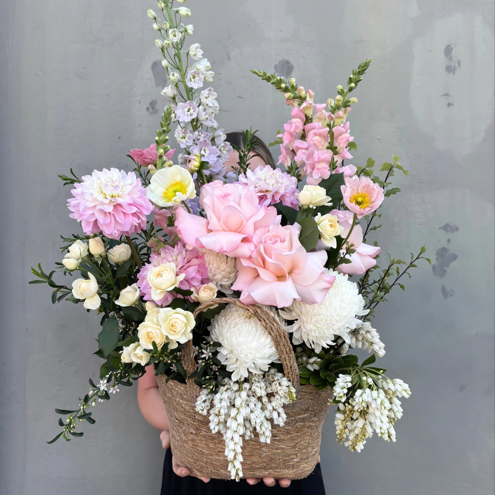 Elevate your space with Basket of Blooms, a one-of-a-kind take on the classic flower basket. Featuring a mix of luxurious textures and exquisite blooms, this is the perfect addition to your seasonal decor.