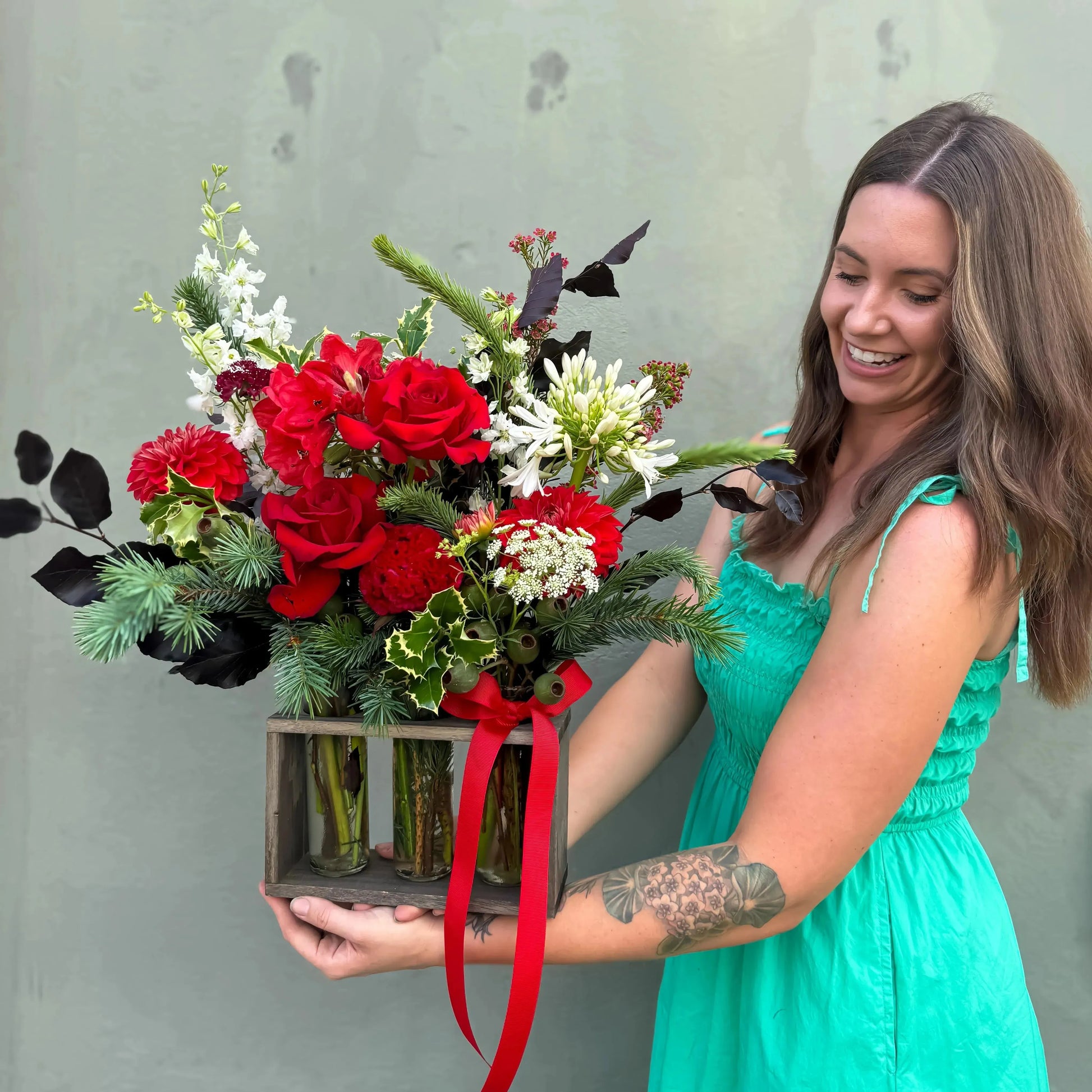 Rustic Mossbud Charm is a festive arrangement of seasonal blooms in rustic bud vases, bringing the warmth and beauty of Christmas into your home. A perfect touch of holiday magic inspired by nature.