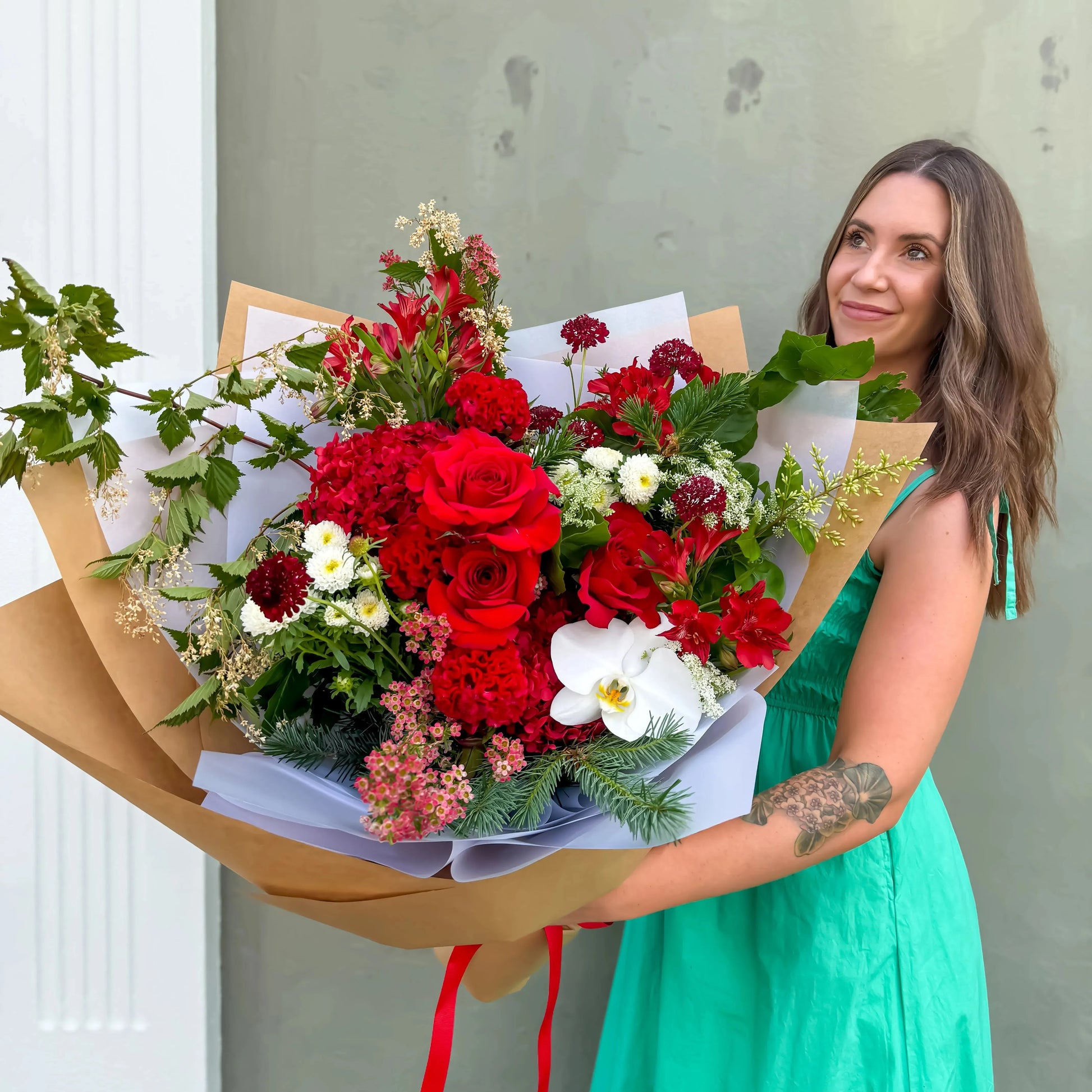 Enhance your holiday décor with our Whimsical Woodland Elegance, featuring a luxurious blend of deep reds, crisp whites, and festive foliage. Tied with a stylish red ribbon, this bouquet brings a touch of elegance and Christmas charm to any setting. It makes the perfect gift or centrepiece for a sophisticated holiday celebration.