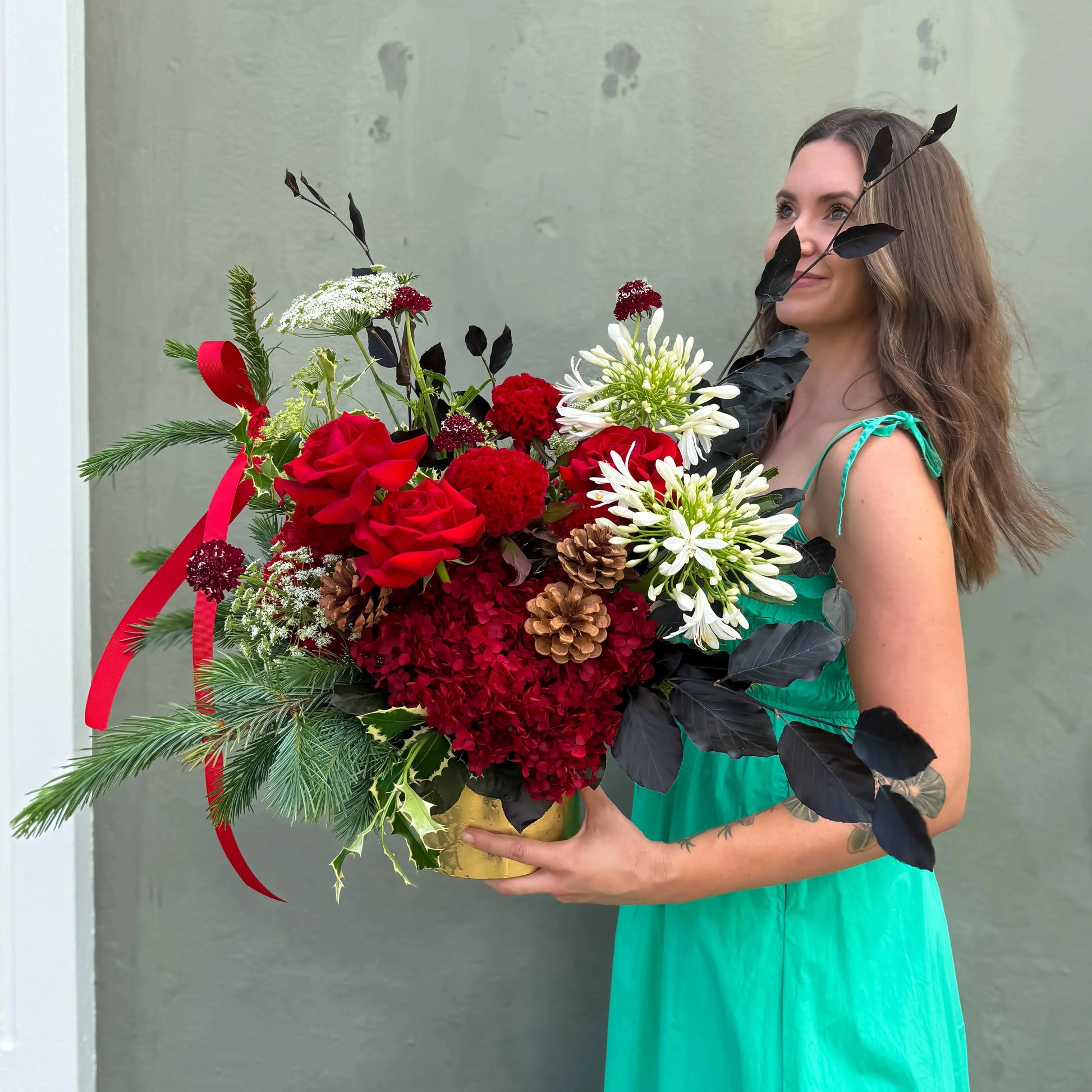 Enchanted Golden Grove brings Christmas cheer to any space. Displayed in an elegant golden vase, it features a vibrant mix of seasonal blooms in rich reds, crisp whites, and lush greenery. This arrangement adds glamour and holiday spirit to your home, spreading joy wherever it is placed.