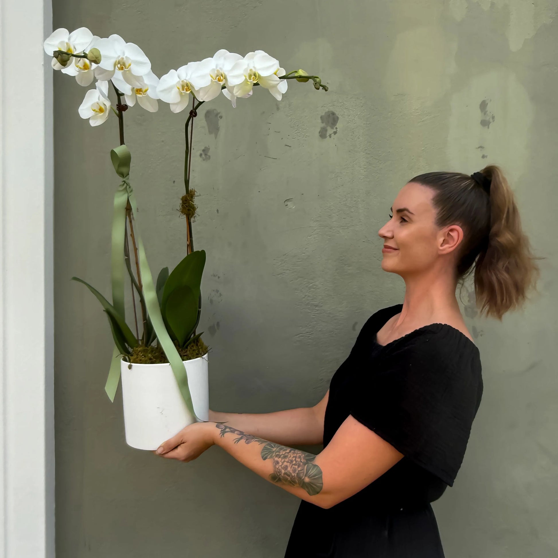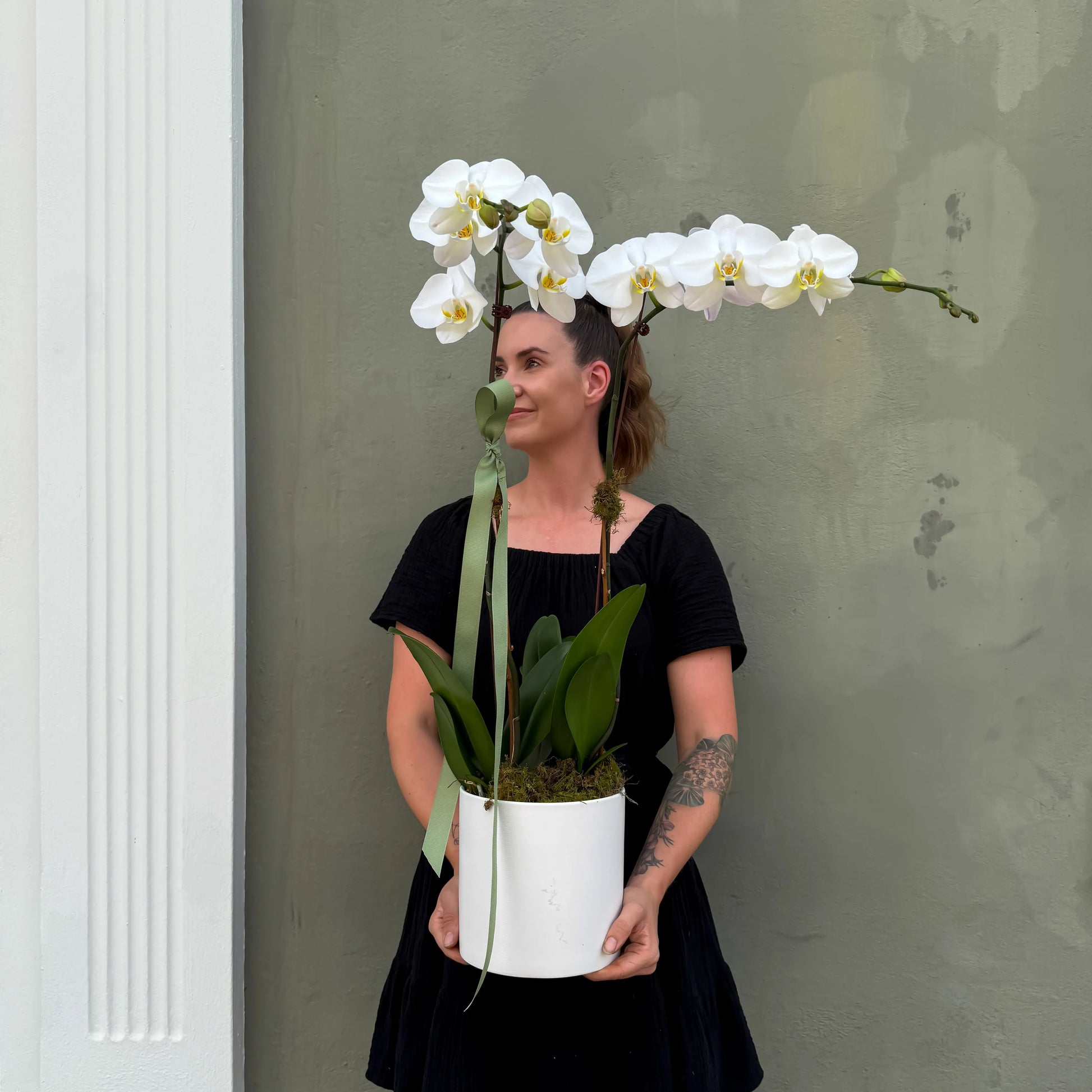 Phalaenopsis Orchids are the ultimate luxury, chosen for their timeless elegance and ease of care. They will bring a touch of nature and beauty to any space, and are presented in  a white florist choice ceramic vessel  finished with forest foraged  moss and cascading ribbon. This gift is sure to impress and will be cherished for months to come.